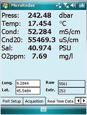 便攜式數(shù)據(jù)讀取裝置通過(guò)內(nèi)置的RS232C接口與OCEAN SEVEN 3XX CTD連接,并且專門開發(fā)了用于Windows Mobile?操作系統(tǒng)的軟件:ZTERM和μREDAS。這些軟件允許使用者直接對(duì)CTD進(jìn)行各種操作,如傳感器校準(zhǔn),實(shí)時(shí)數(shù)據(jù)采集,配置等。